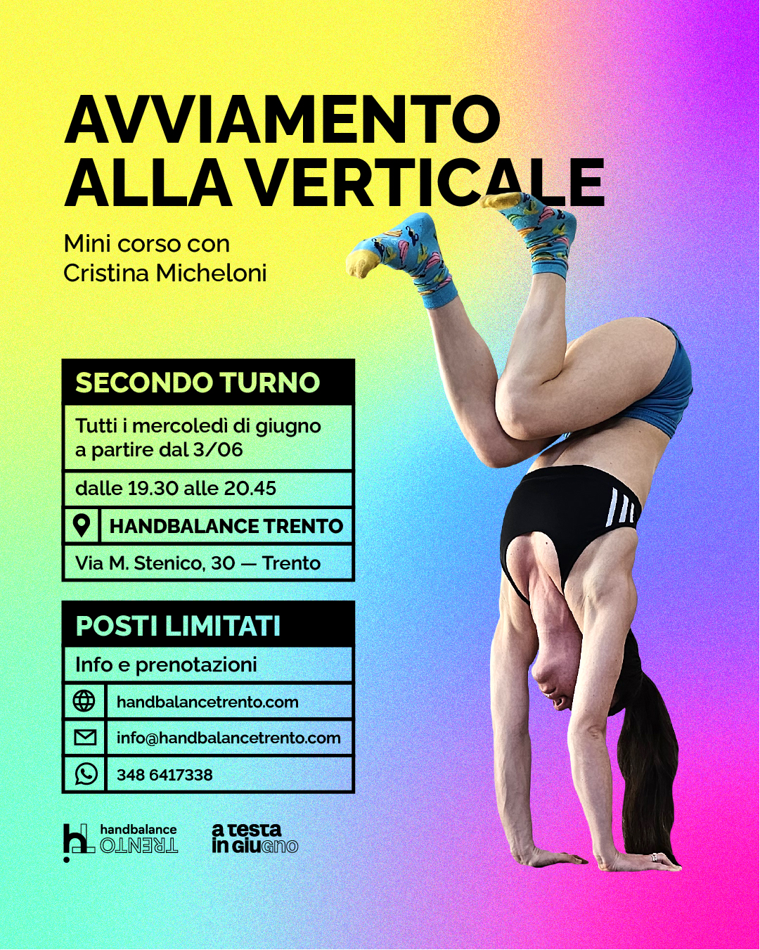 | Aperitivo/Gelato verticale 18:30-20:30 Parco Le Albere o HandbalanceTrento | Avviamento alla verticale Primo turno 18:00-19:15 Handbalance Trento | Mini corso flessibilità – BASE 18:00-19:00 Handbalance Trento | ||